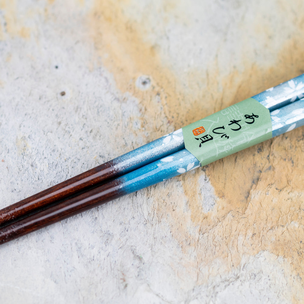 Pałeczki Hanabiyori w wersji Blue łączą chłodny, błękitny odcień z delikatnym motywem białych kwiatów. Zdobienie wykonano techniką Raden — inkrustacją masą perłową, która po wypolerowaniu daje subtelny, opalizujący blask. To kunsztowne rzemiosło sprawia, że każda para wygląda jak małe dzieło sztuki.