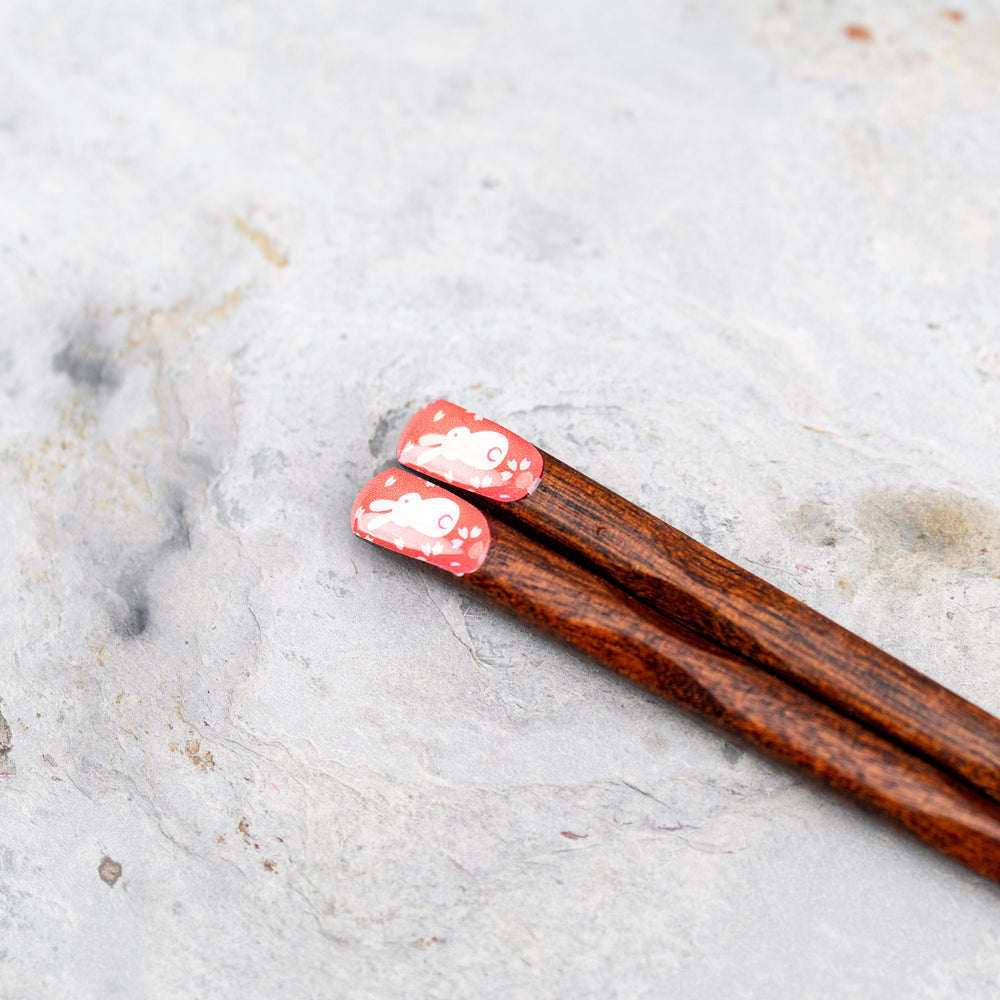 Pałeczki Hanausagi w wersji Pink urzekają subtelnym motywem króliczka w białym kolorze na pastelowym, różowym tle, umieszczonym na górnej części. Spiralne żłobienia nadają im lekko rustykalny charakter i poprawiają chwyt.