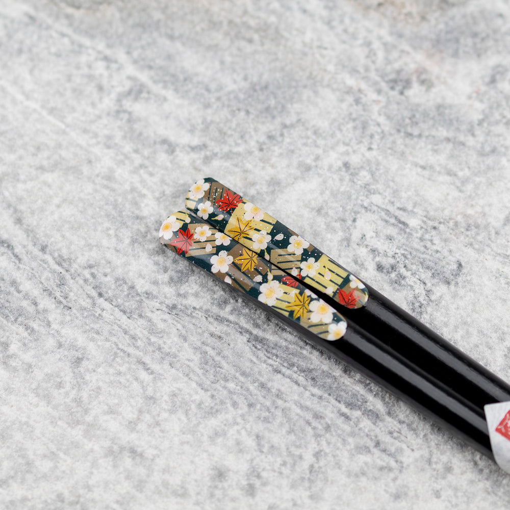 Pałeczki Japanesque w wersji Plum zdobi tradycyjny motyw kwiatu śliwy, który w japońskiej kulturze symbolizuje odrodzenie, siłę i nadzieję. Subtelny, wielobarwny wzór harmonijnie komponuje się z głęboką czernią drewna, nadając pałeczkom elegancki i ponadczasowy charakter.