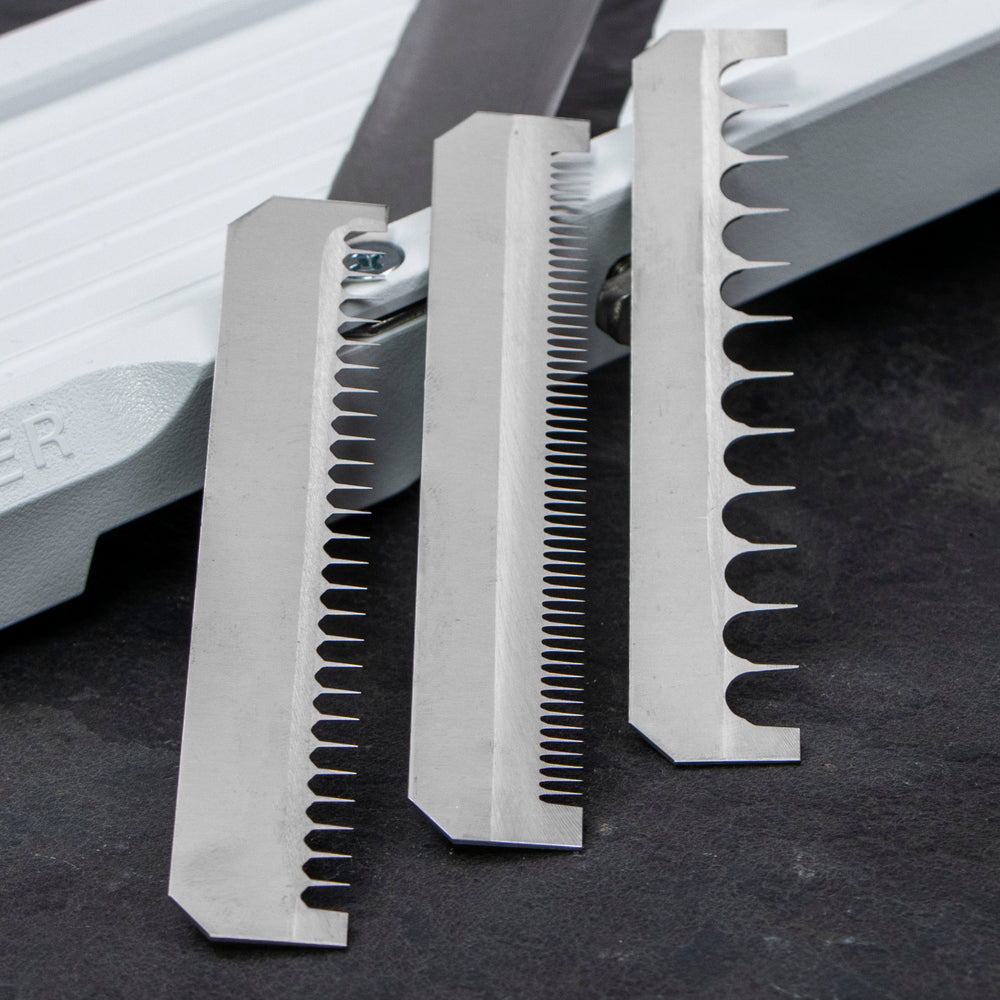 • Mandolina ma szerokość roboczą 6,4 cm i jest wyposażona w cztery ostrza z hartowanej stali: jedno płaskie o prostej krawędzi i trzy ząbkowane o różnych rozstawach ząbków.