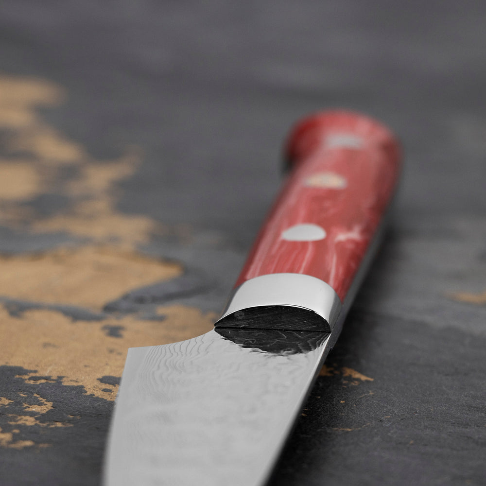 Noże wykonane ze stali R-2 charakteryzują się świetnymi właściwościami tnącymi oraz długim czasem trzymania ostrości. Wymagają one minimalnych zasad konserwacji. Nóż ten sprawdzi się świetnie zarówno w rękach początkującego kucharza jak i profesjonalisty.