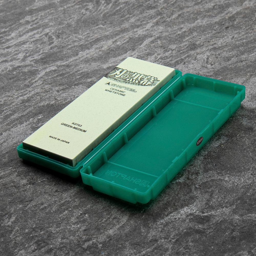 • Kamienie Shapton to najwyższa jakość kamieni do ostrzenia. Seria Kuromaku to pierwsza seria kamieni, która konsekwentnie miała przypisany kolor do gradacji – w przypadku większych zestawów usprawnia to wybór odpowiedniego kamienia. Pudełko na kamień może służyć jako podstawka do ostrzenia.