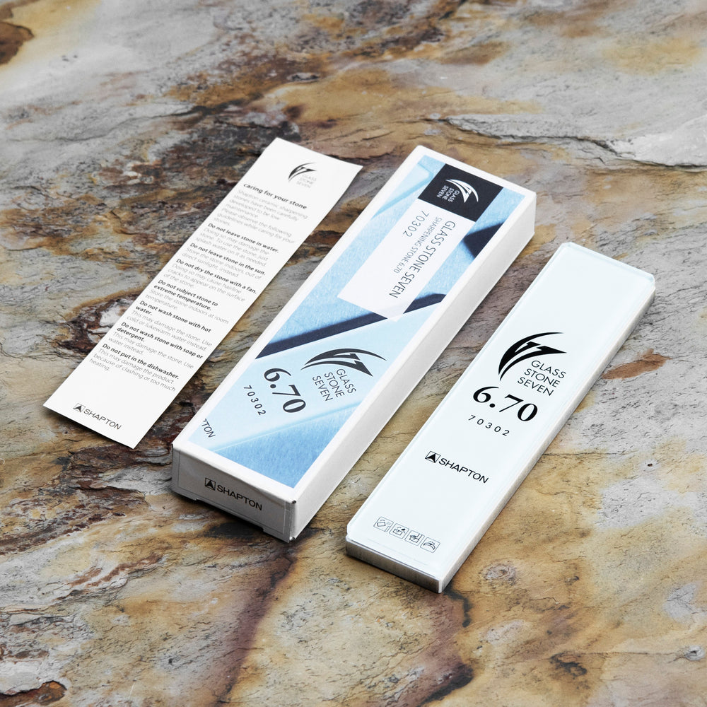 • Kamienie Shapton z serii Glass Seven to najnowocześniejsze rozwiązania w kwestii znanej ludzkości od tysięcy lat. Ostrzenie noży na kamieniach Glass, przebiega szybko I sprawnie. Do podstawy wykonanej z hartowanego szkła, przytwierdzany jest materiał ścierny – biały korund, jeden z najtwardszych minerałów na świecie, dzięki temu charakteryzują się widocznie dłuższą żywotnością niż tradycyjne kamienie. Kamienie Glass Seven nie wymagają takiego przygotowania jak tradycyjne kamienie wodne, wystarczy przed ostrzeniem spryskać je wodą, bez długotrwałego przechowywania w zbiorniku.