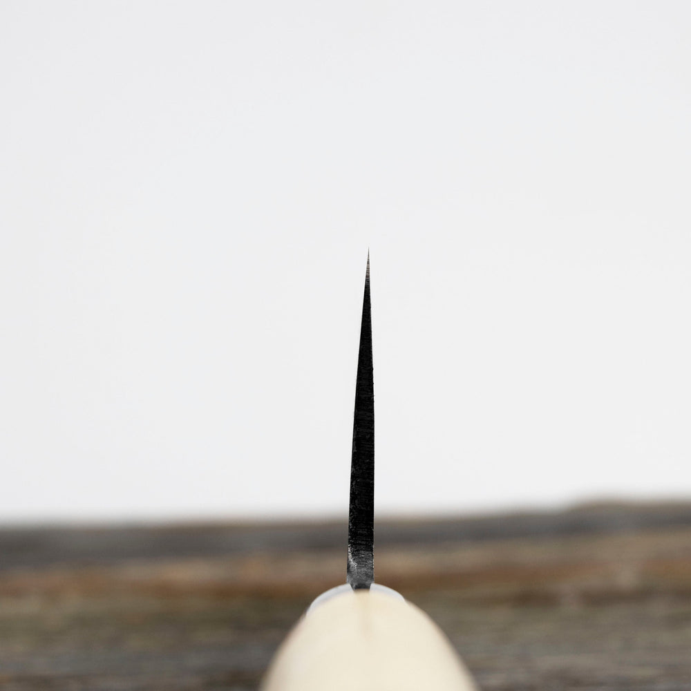 Carbon steel requires much more care than stainless steels. The basic principle of the maintenance of carbon steel knives is to wipe them dry, leaving a dirty knife even for a moment will quickly cover it with a patina. After wiping the knife dry, it is best to lubricate it with a small amount of camellia oil, which will additionally protect the blade. Leaving a wet knife to dry on its own will result in the appearance of small spots of rust. It is completely unacceptable to wash the knives in a dishwasher, chemicals and high temperature will negatively affect the handle and the blade, it can also lead to permanent damage to the knife. The knife is used only for cutting soft, boned and non-frozen products. If the blade comes into contact with the bone, it can chip. When cutting, do not twist the knife from side to side, as it may break the tip if the knife is jammed in the product. The wood and plastic boards recommended by us, cutting on glass or stone boards is prohibited, it will lead to an accelerated process of blunting the knife and possible nicks. The knife should only be used as a cutting tool, the thin, sharp design perfectly cuts the products, but when you try to open the jars, the blade may chip.