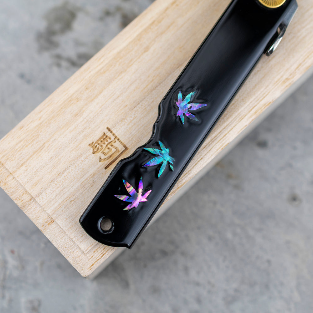 Rękojeść pokryta jest warstwą tradycyjnego japońskiego lakieru Urushi, znanego ze swojej trwałości i odporności na zarysowania. Mechanizm składania bez blokady (tzw. friction folder) pozwala na intuicyjne otwieranie jedną ręką, pozostając wiernym klasycznej formie noży Higonokami.