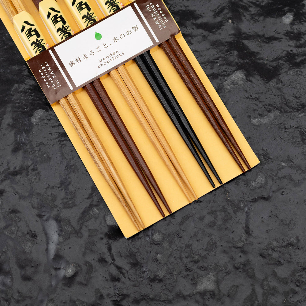 Zestaw Octagon 5P to pięć par pałeczek wykonanych z różnych gatunków drewna, dzięki czemu każda para prezentuje unikalny odcień i strukturę słojów. Charakterystyczny ośmiokątny kształt sprawia, że pałeczki dobrze leżą w dłoni, są wygodne w użytkowaniu i odpowiednie także dla osób, które dopiero zaczynają swoją przygodę z pałeczkami.