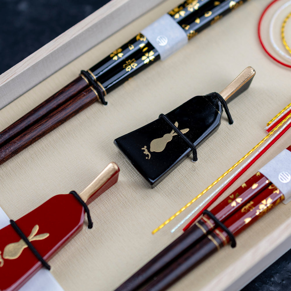 Zestaw Hanakagari × Hagoita Usagi łączy w sobie elegancję japońskich pałeczek z bogactwem tradycyjnej symboliki. W komplecie znajdują się dwie pary pałeczek – czarne i czerwone – ozdobione subtelnym, złotym wzorem oraz miniaturowe hagoita z motywem królika (*usagi*).
