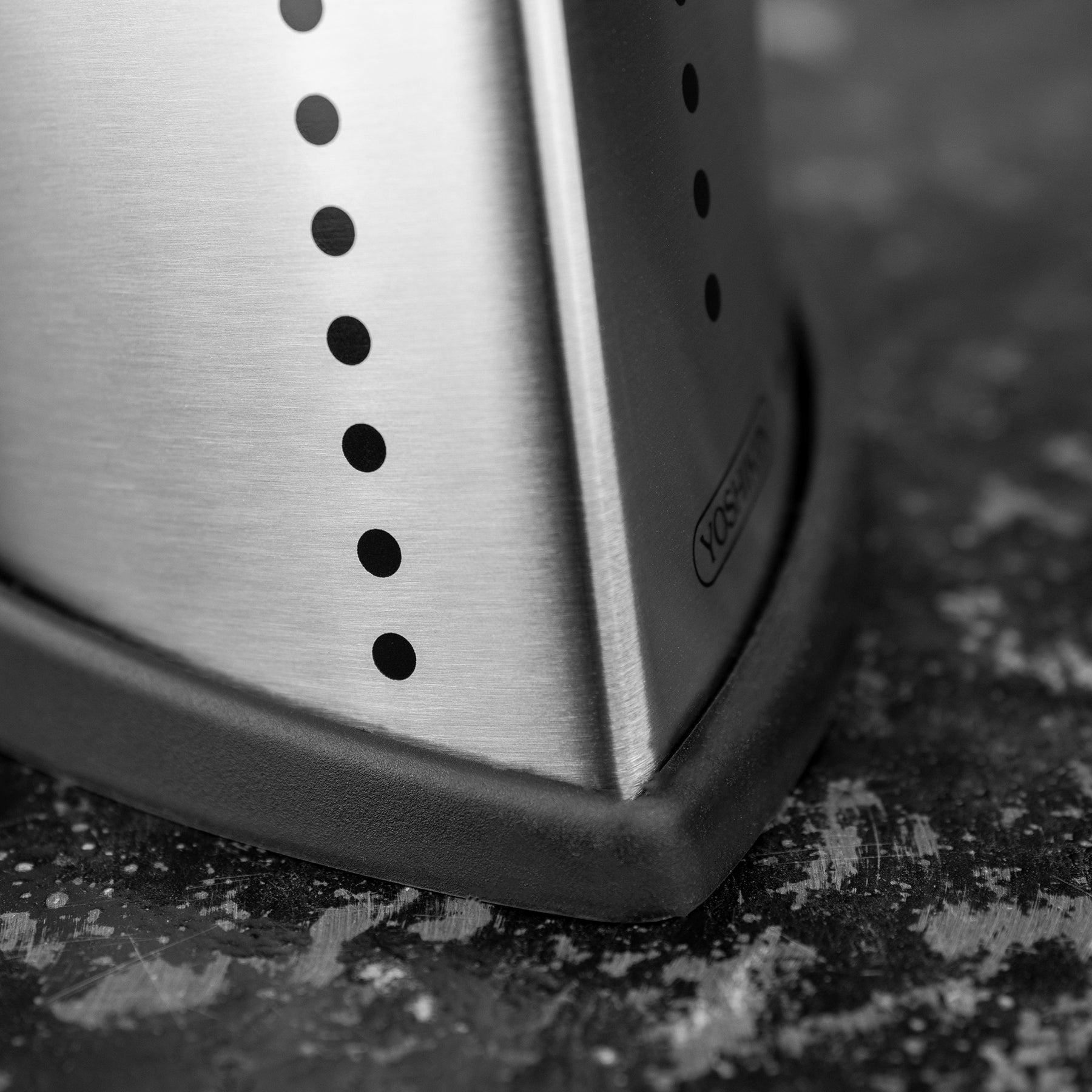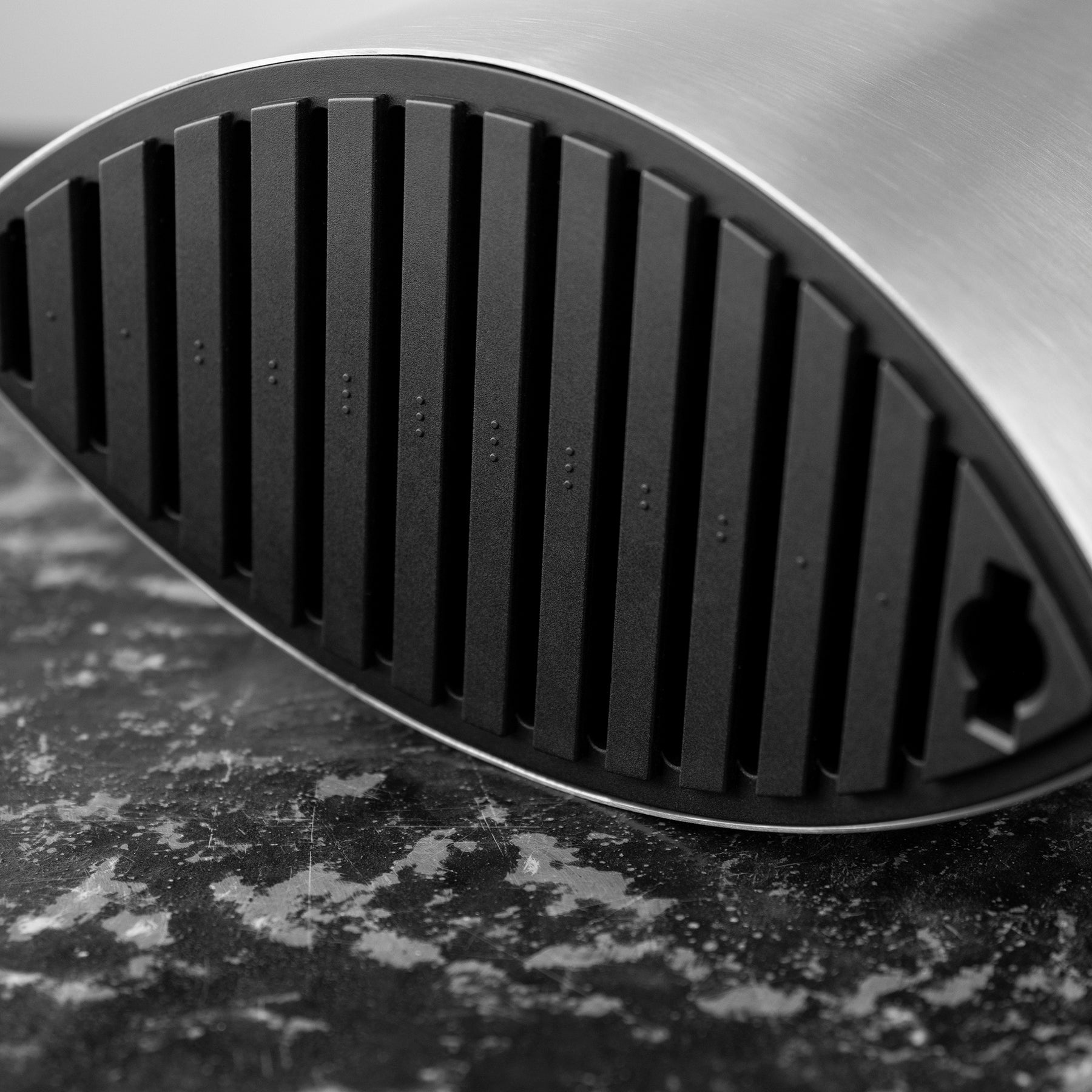 • Duży blok z 14 otworami na noże o różnej szerokości (nie dłuższych niż 24 cm) oraz specjalnym otworem na parę nożyczek kuchennych lub pręt ostrzący. Urzekający projekt autorstwa Komina Yamady przypomina kształt żaglowca pod pełnymi żaglami. Wykończony stalą nierdzewną 18/10 kadłub ozdobiono czarnymi kropkami i wyposażono w czarną, przeciwpoślizgową podstawę, którą można zdjąć. Dzięki takiemu rozwiązaniu znika problem czyszczenia otworów, co ułatwia przestrzeganie nawet najwyższych standardów higieny. Ten piękny, funkcjonalny blok pozwoli bezpiecznie przechowywać cenne noże i utrzymywać je w nieskazitelnym stanie.