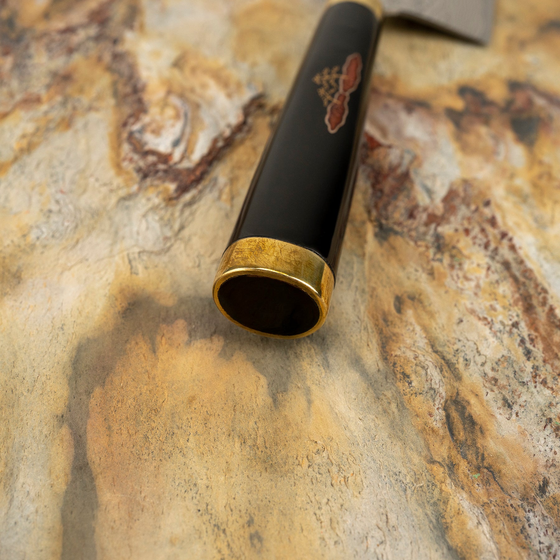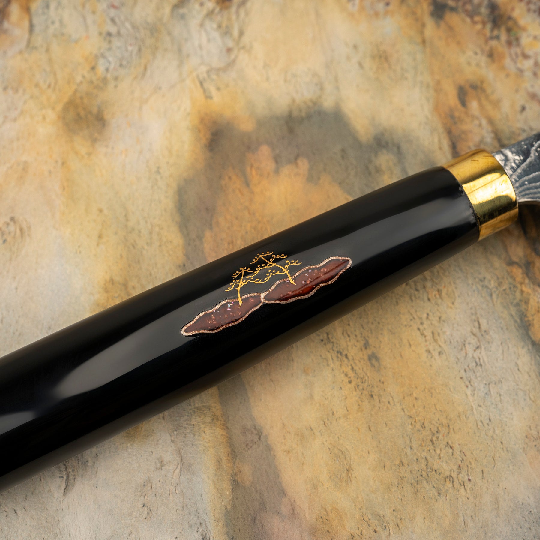 Do każdego noża dołączona jest wyjątkowa saya - ręcznie malowana i starannie dopracowana w każdym detalu. To połączenie tradycyjnego rzemiosła i wyrafinowanej estetyki, które nadaje całości niepowtarzalny charakter. Sam nóż wyróżnia się doskonałą jakością wykonania i unikalnym designem, stworzonym dla osób ceniących perfekcję i dbałość o szczegóły.